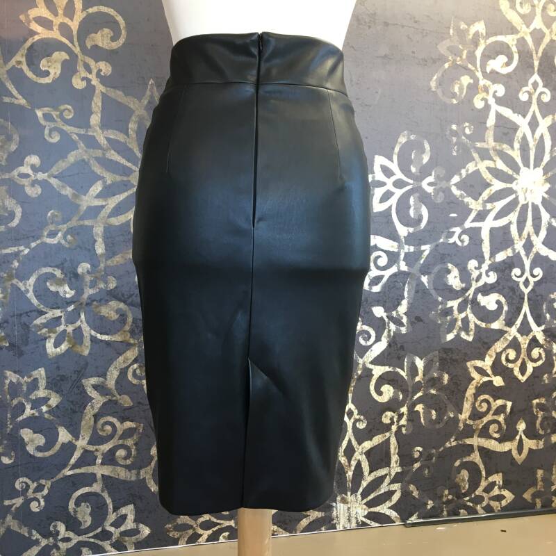 De fifties zijn voor mij qua stijl een dankbare periode. De basis van deze rok komt daar uit voort (pencilskirt), maar de moderne twist zit hem in het gebruik van het soepele (imitatie-) leer. De rok komt tot de knie, er zit een split middenachter. Waar het enigszins kan maak ik altijd zakken, gewoon omdat het handig is. De taille is ongeveer 5 cm verhoogd, zodat je benen langer lijken. Er zit een beetje stretch in het leer, zodat hij strakker zit dan niet-stretch.